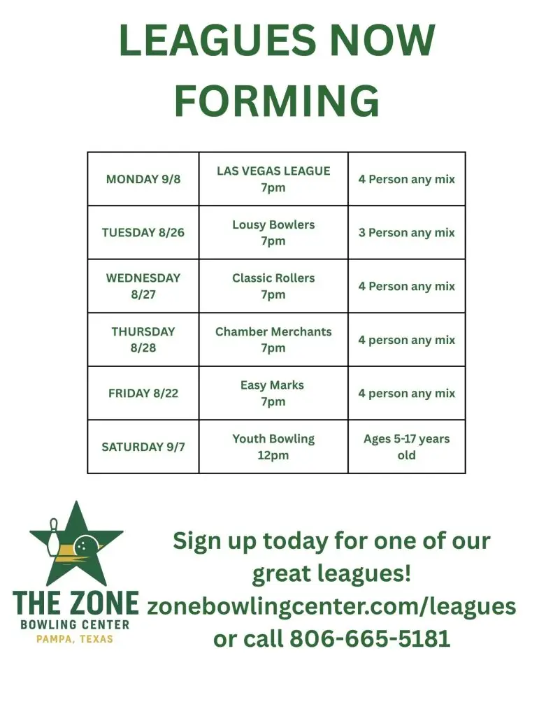 Premier Bowling League for All Skill Levels LEAGUES JOIN A LEAGUE We offer a wide range of friendly and competitive leagues from youth to senior. Contact us today to join! CONTACT FOR JOINING LEAGUE Please enable JavaScript in your browser to complete this form.Select League *Select LeagueTuesday Lousy Bowlers (Fall)Tuesday Lousy Bowlers (Spring)Wednesday Nights Classic Rollers (Fall)Thursday Nights Chamber Merchants (Fall)Friday Night Easy Marks (Fall)Pampa Youth Bowling Club (Fall)NAME *Email *BirthdayPhone *Do you have a team?Do you have a team?YesNoPhoneSubmit